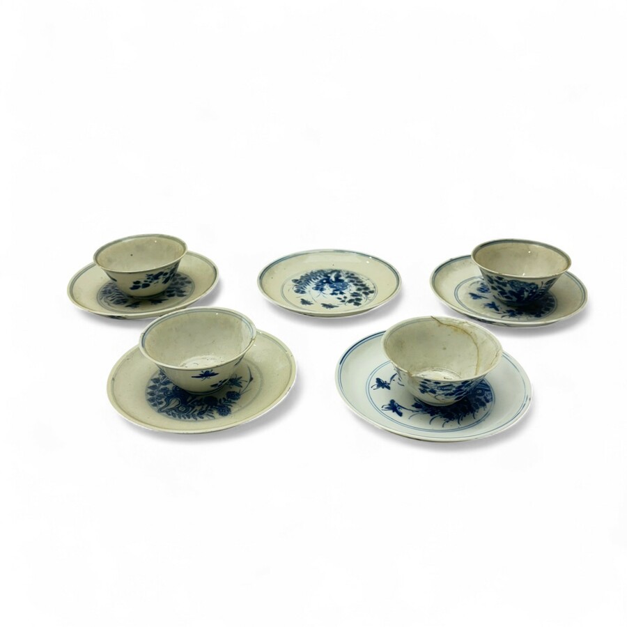 Lot van vier Chinees porseleinen kopjes en vijf bijpassende schotels, Kangxi periode (1662-1722), met onderglazuur blauw-wit decor van bloemen en vlinders.