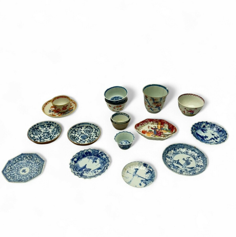 Lot divers 18e eeuws Chinees porselein, diverse decors. Waaronder een Famille Rose pattipannetje, in goede staat.