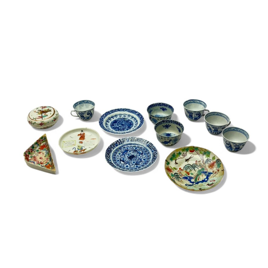 Lot divers 19e eeuws Chinees porselein, waaronder een fraai 19e eeuws schoteltje met karaktertekens