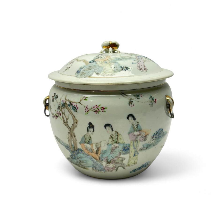 Een antieke laat 19e of vroeg 20e eeuwse Chinees porseleinen dekselpot, aan de voorzijde en op de deksel versierd met resp. twee en drie converserende dames, aan de achterzijde met karakterteken...