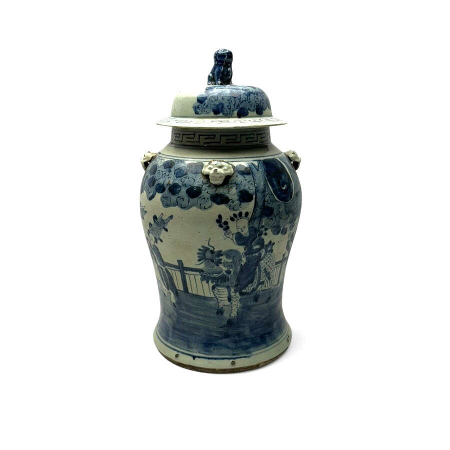 Een 19e of 20e eeuwse Chinees porseleinen balustervormige dekselvaas, met onderglazuur blauw-wit decor van kinderen, één rijdend op fantasiedier, en drie met vlaggen. Bovenzijde rand versierd me...