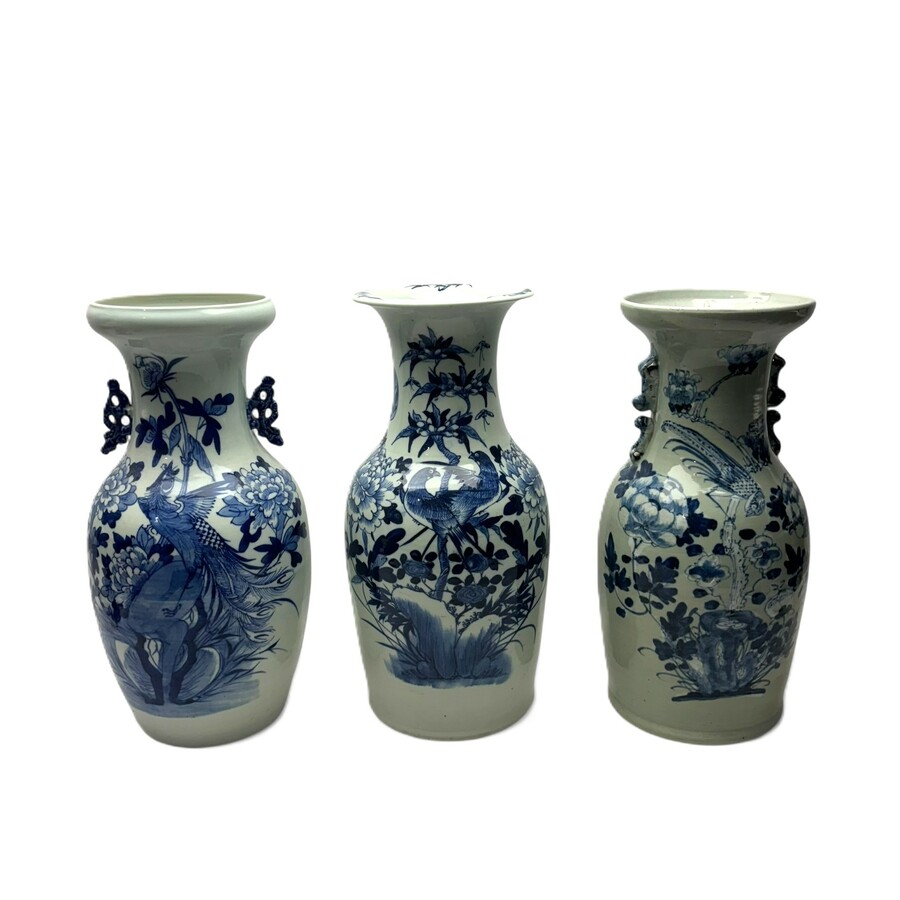 Lot van drie antieke 19e eeuwse Chinees porseleinen vazen, met onderglazuur blauw-wit decor van bloemen en vogels.