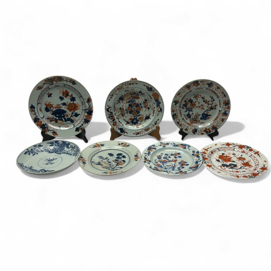 Lot van zeven Chinees porseleinen schotels, imari en blauw-wit, Kangxi periode (1661-1722), Qianlong periode (1735-1796) en één 20e eeuws bord.