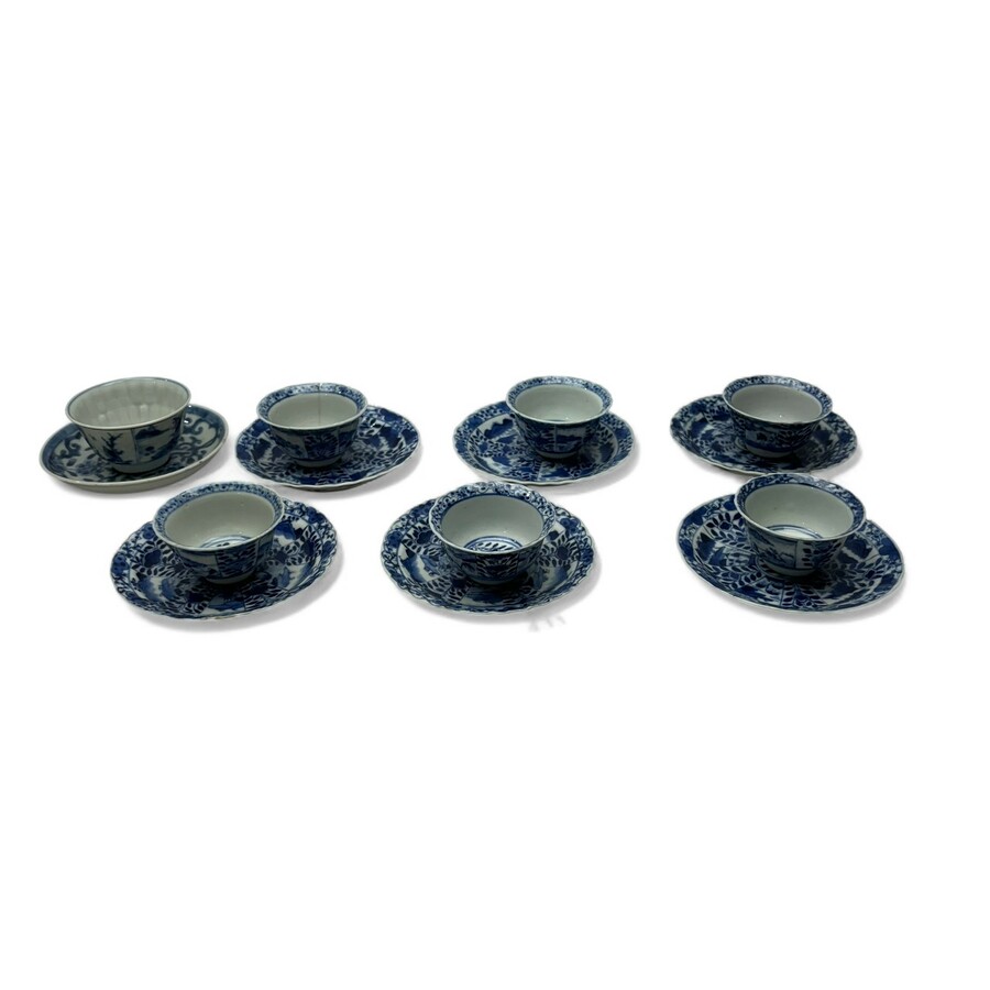 Lot 18e en 19e eeuwse Chinees porseleinen kop en schotels, bestaande uit een set van zes 19e eeuwse kop en schotels, onderglazuur blauw decor van landschappen en bloemen, aan de onderzijde gemer...