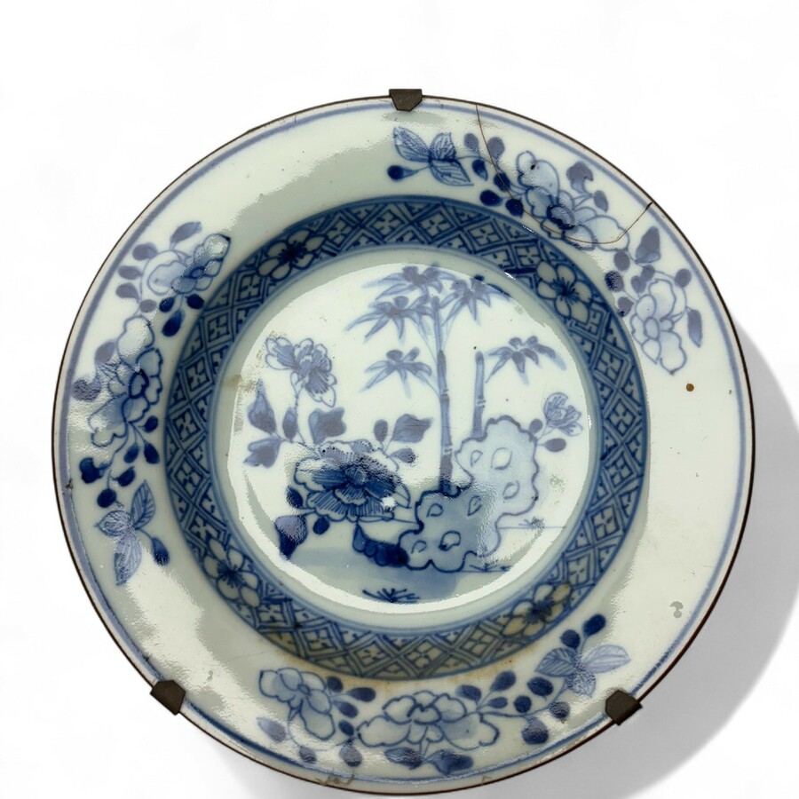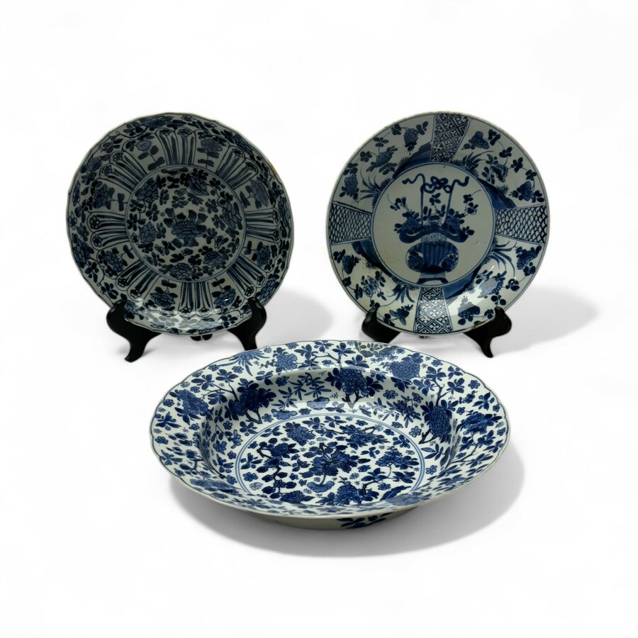 Drie Kangxi en revival porseleinen schotels. Waarvan 1 diepere schotel. Blauw/wit met florale decors op de randen en het plat. 1 gemerkt met zes karaktermerk voor de Kangxi periode.