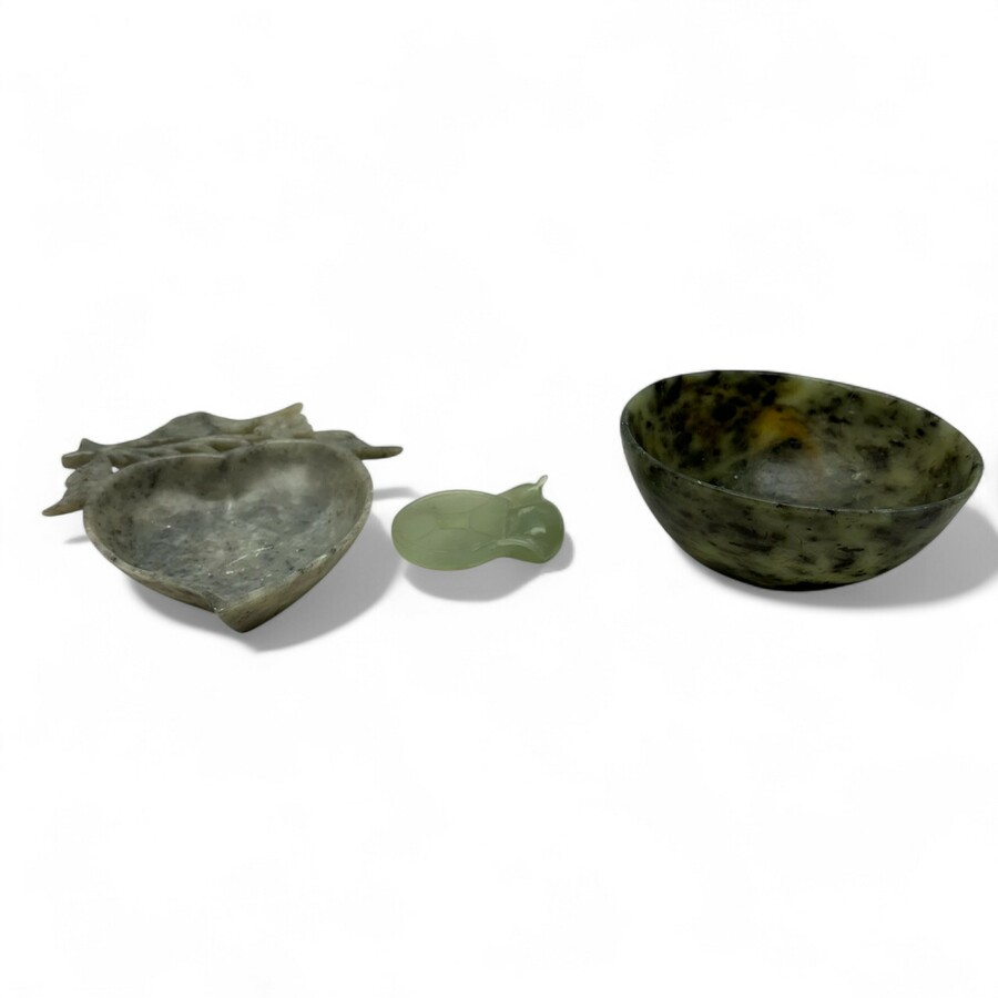 Drie Chinees serpertijnen voorwerpen. Bestaande uit een kom, brushwasher in de vorm van een perzik en een geluksmunt met rat.