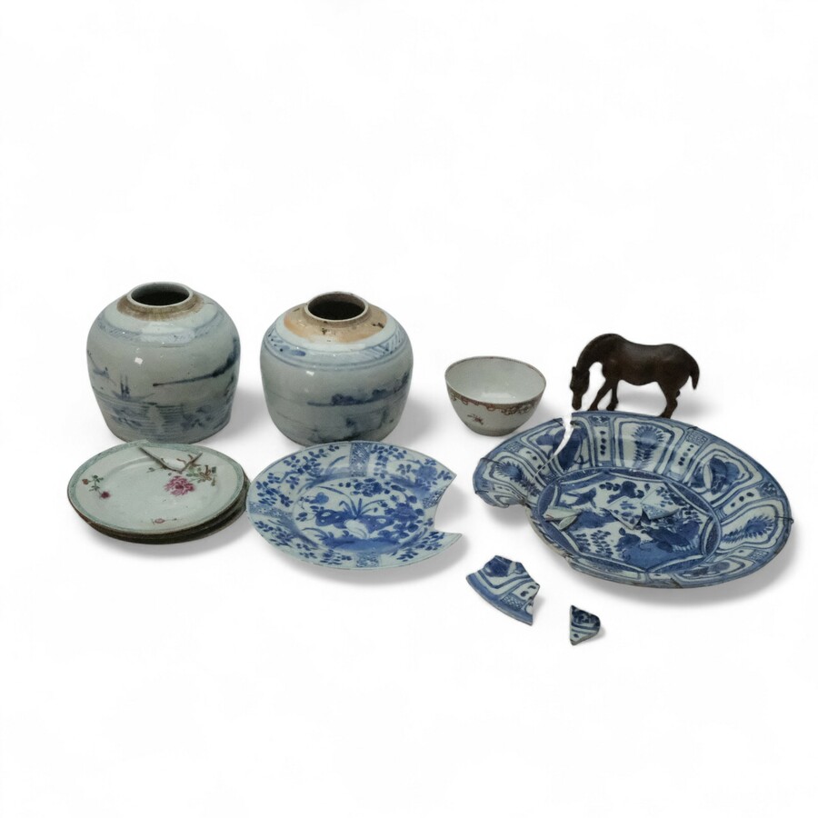Lot divers Chinees: twee vroeg 19e eeuwse gemberpotten, 19e of 20e eeuws houten paard, 18e eeuws blauw-wit Kangxi bord, 18e eeuwse Famille Rose kom en twee 18e eeuwse Famille rose bordjes.