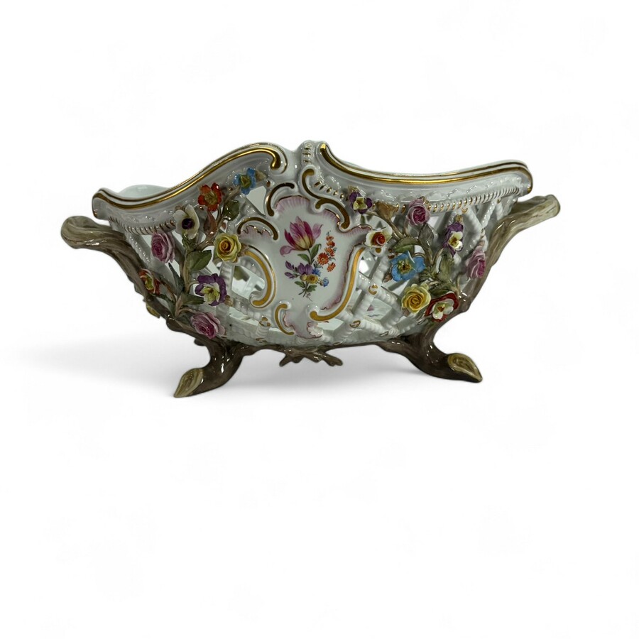 Een antieke porseleinen opengewerkte fruitmand op takvormige voetjes en grepen, hoog. Gemerkt voor Meissen. 19e eeuws. Enkele kleine beschadigingen rondom.