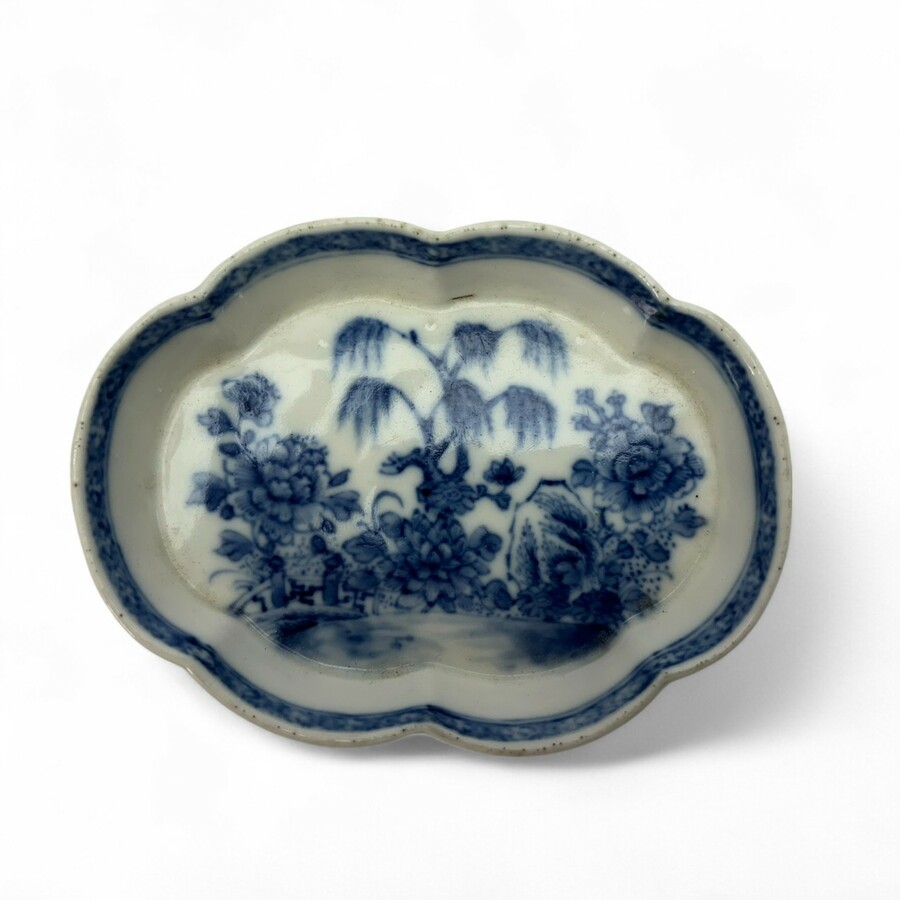 Een antiek 18e eeuws Chinees porseleinen pattipan, Qianlong periode (1735-1796), met opstaande gecontourneerde rand en onderglazuur blauw-wit decor van een landschap met bloemen en wilgen.