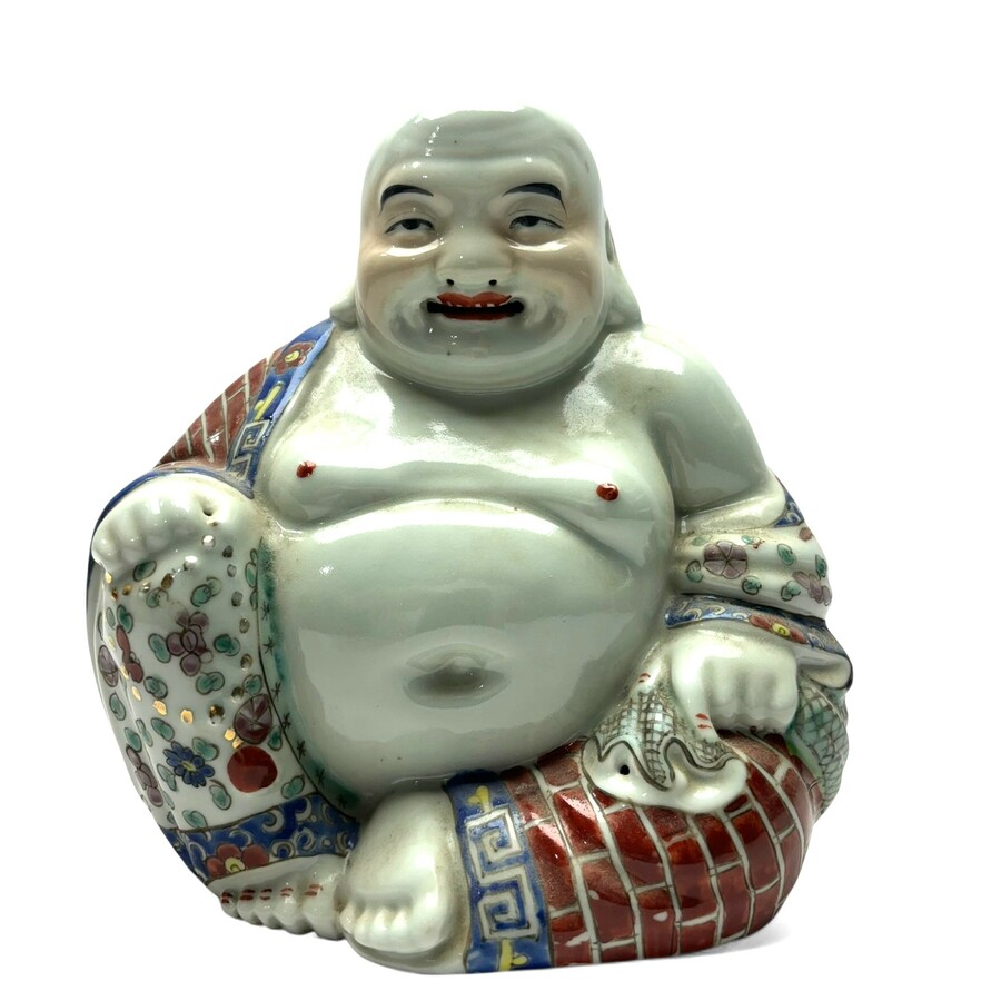 Een vroeg 20e eeuwse porseleinen zittende Boeddha, zgn "brick Boeddha". Polychroom beschilderd.
