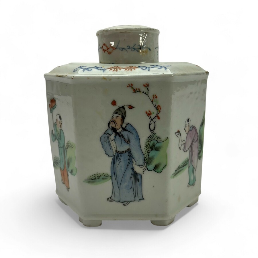 Een vroeg 20e eeuwse Chinees porseleinen zeskantige theebus met originele dop. Polychroom met decor van zes Oosterse figuren. Republiek periode. Gemerkt aan de onderzijde.