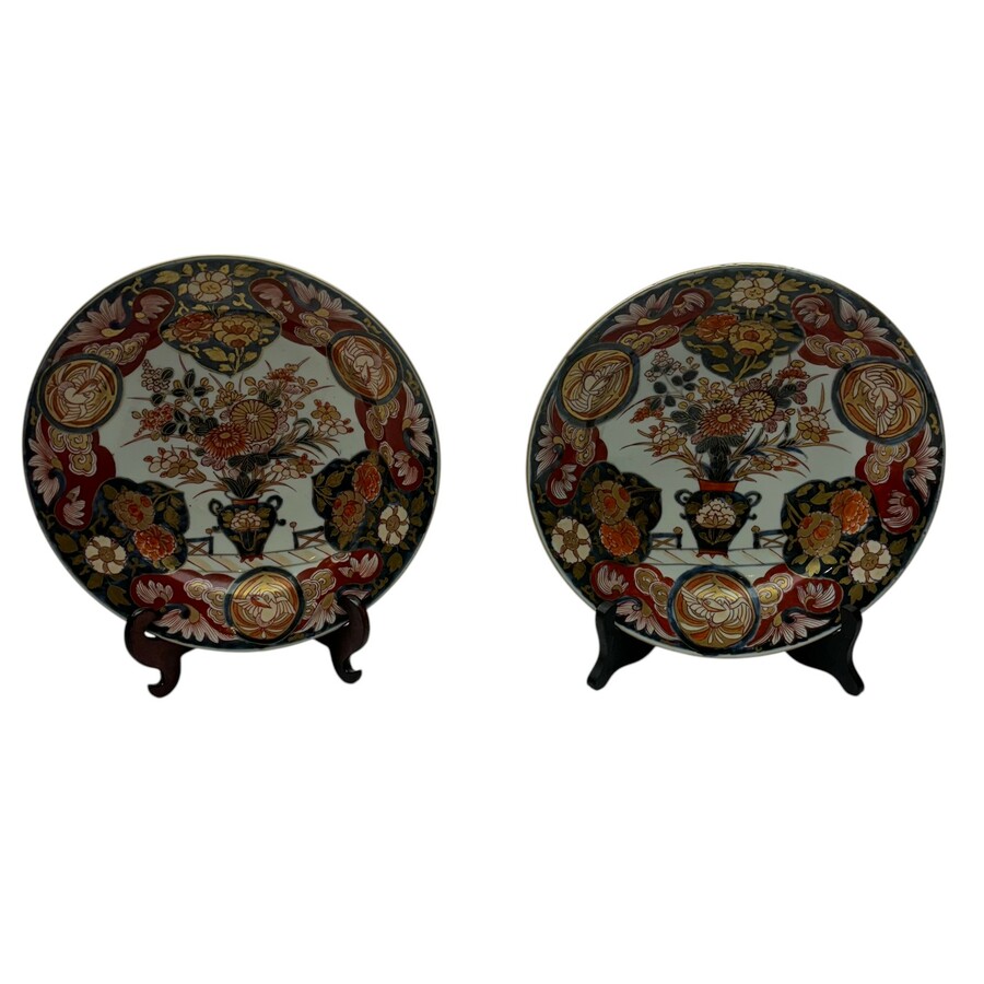 Lot van twee antieke 18e eeuwse Japanse imari borden, met op het plat voorstelling van een bloemenvaas.