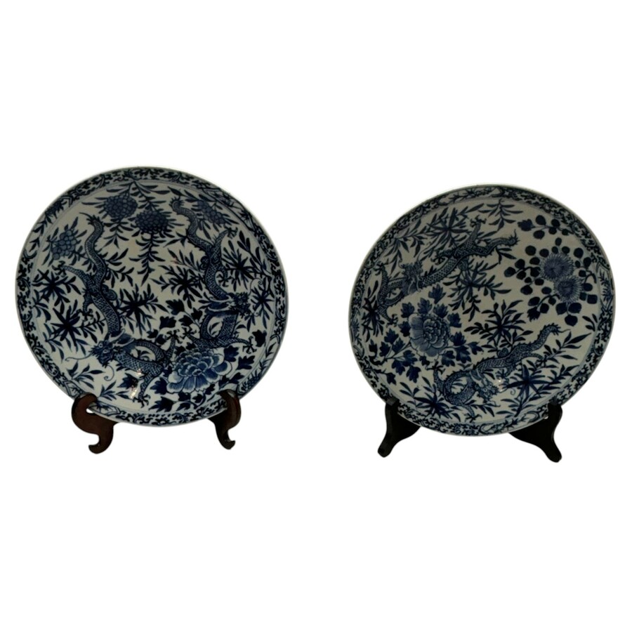 Een stel antieke laat 19e eeuwse Chinees porseleinen borden, met onderglazuur blauw-wit decor van bloemen en draken. Ongemerkt.