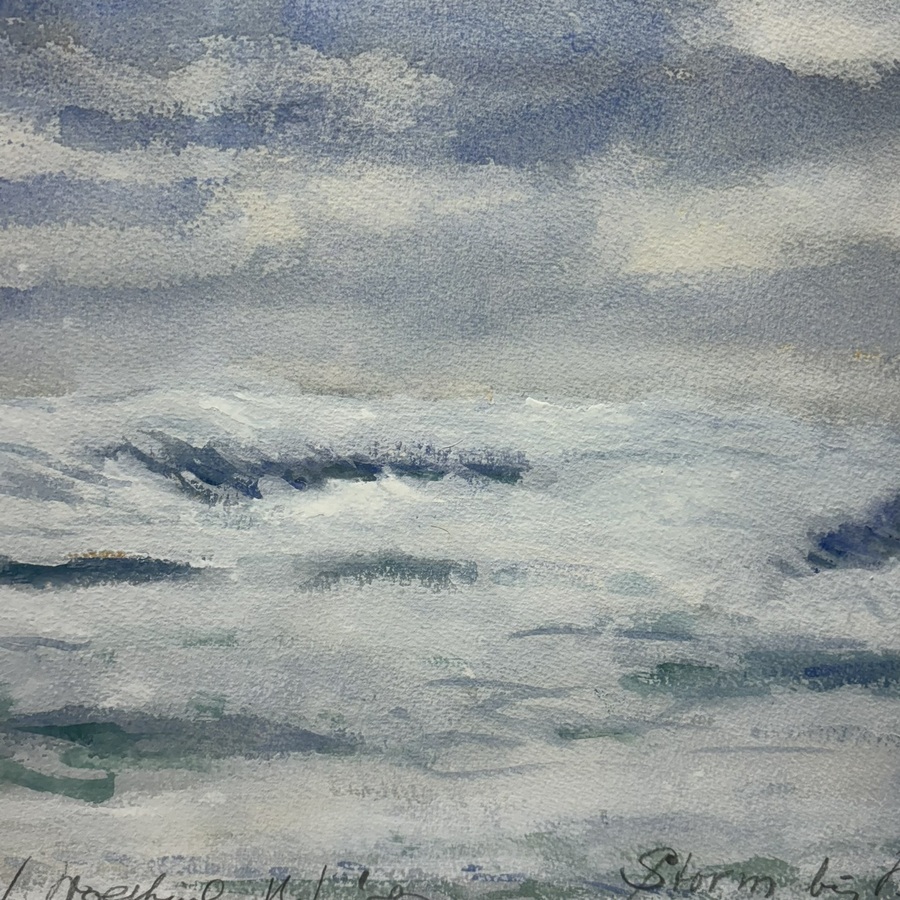 Aquarel op papier. Storm bij Bergen aan Zee, 16/9/1978. Linksonder gemonogrammeerd.
