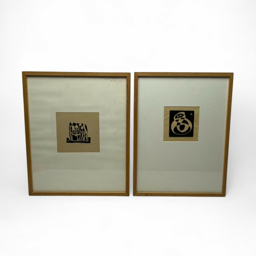 Dirk Kerst Koopmans (1906-1998). Twee houtsnedes op papier, abstracte voorstellingen. Diverse figuren en abstract motief.