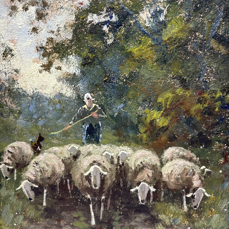 Schilderij olieverf op paneel. De schapenhoedster, naar Martinus Nefkens. Gesigneerd LO.