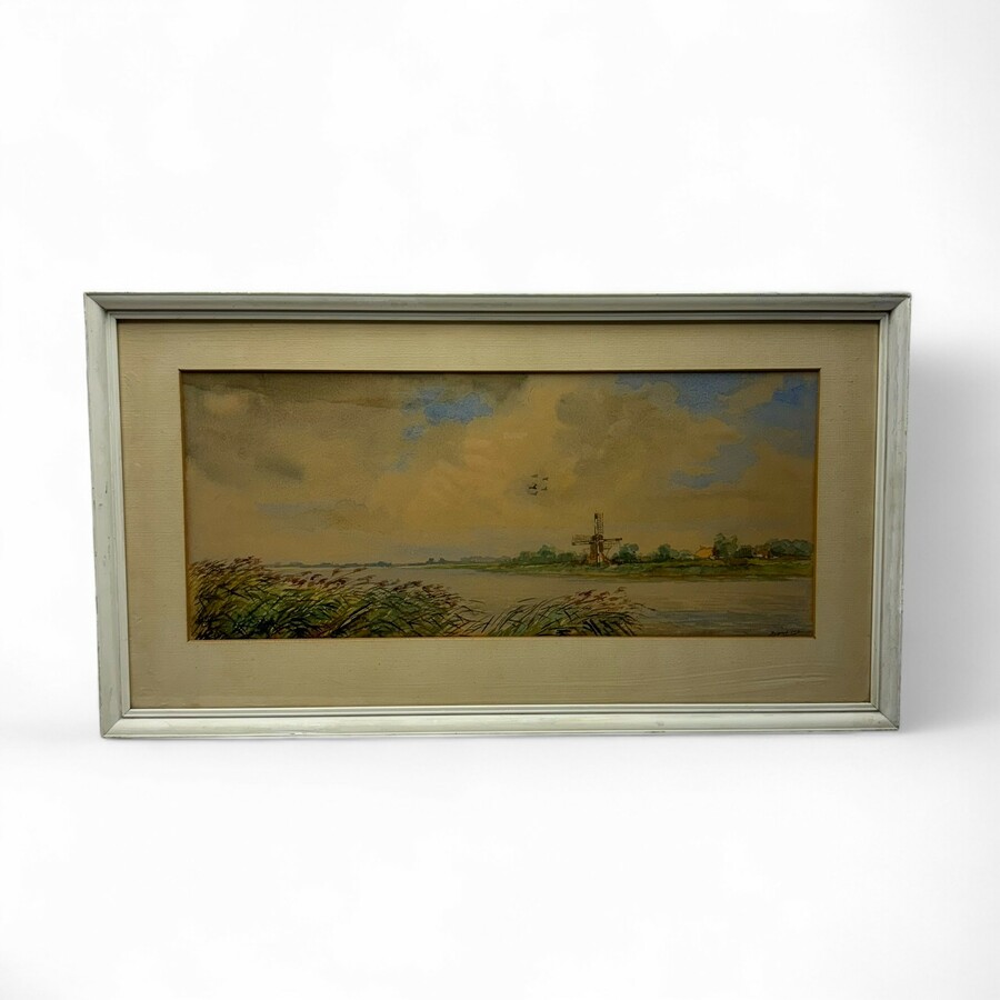 Sjoerd de Vries (1909-1996). Aquarel op papier. Waterlandschap met spinnekop molen en rietkraag. Gesigneerd RO.