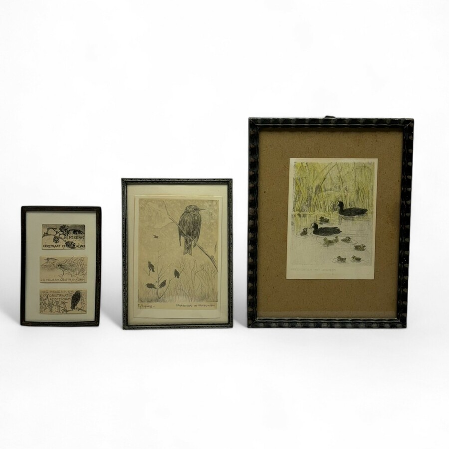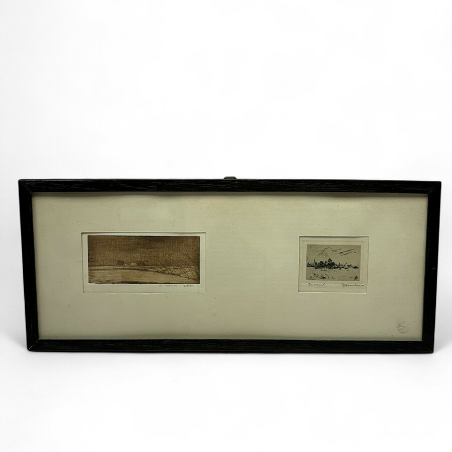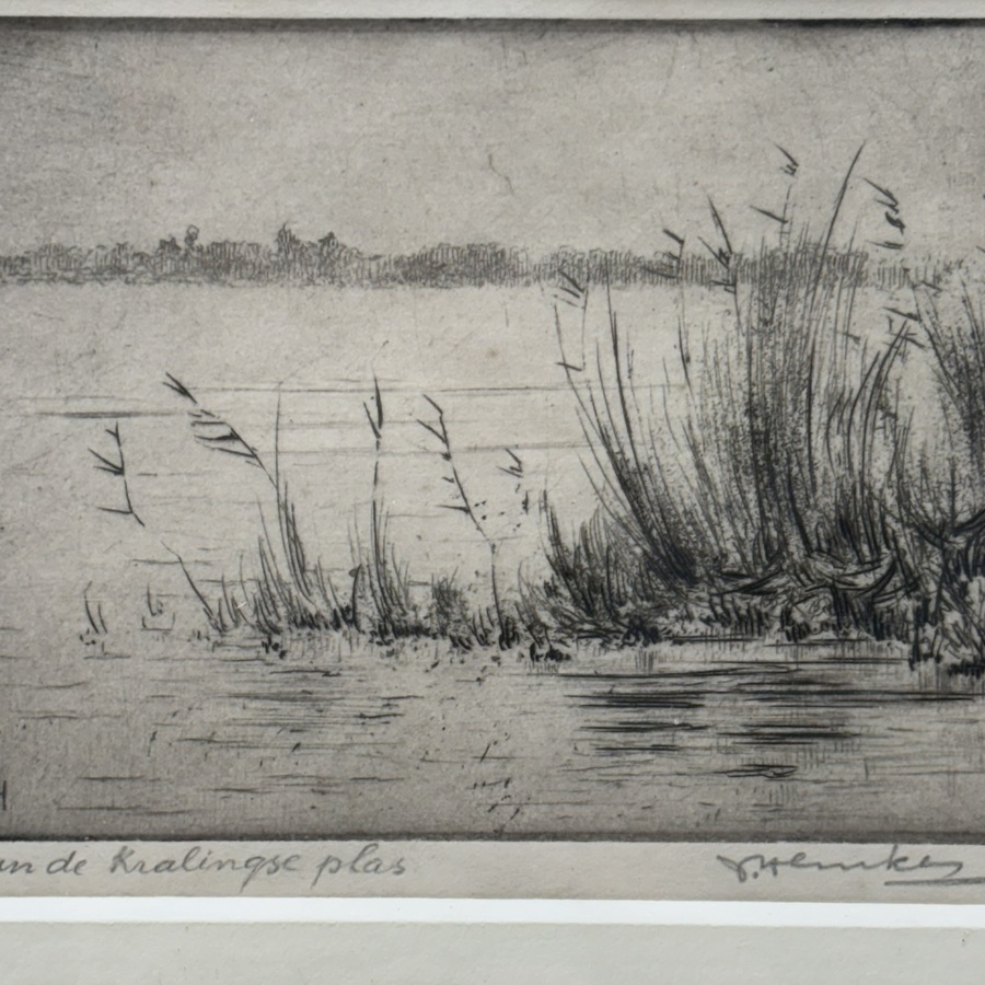 Johan Hemkes (1894-1988 Vier kleine etsen in drie lijsten. Met voorstellingen van Grouw, De potten bij Sneek en aan de kralingse plas.