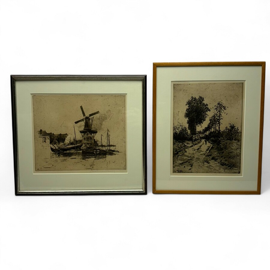 Martin van Waning (1889-1972). Twee etsen op papier Molen aan de vaart te Haarlem en bospad. Gesigneerd in de plaat en met potlood.