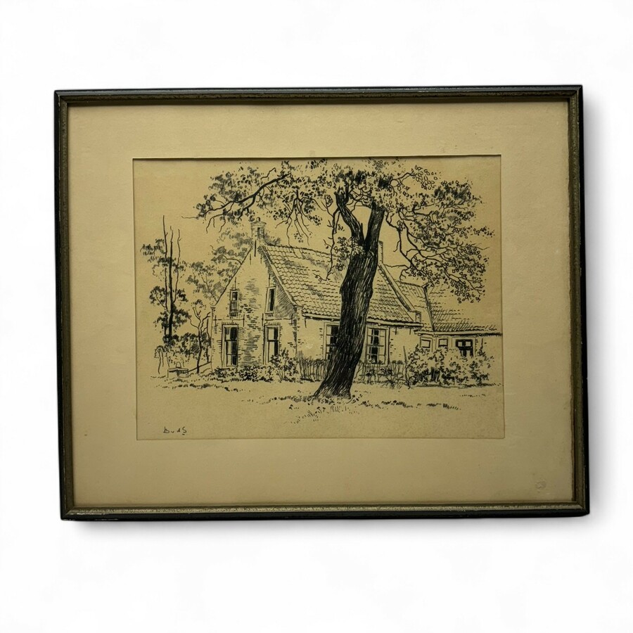 Bouke van der Sloot (1908-1995) Potlood tekening op papier. De boeren woning tussen de bomen. Gesigneerd B.v.d.S.