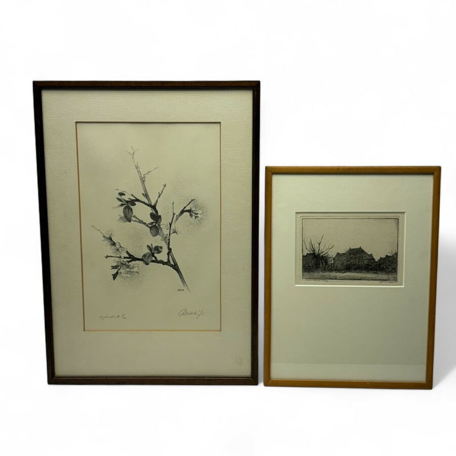 Jan Arjen Deodatus (1914-1986). Een litho 5/20 en een ets 20/20 op papier. Dorpsgezicht en bloesemtak. Gesigneerd met potlood.