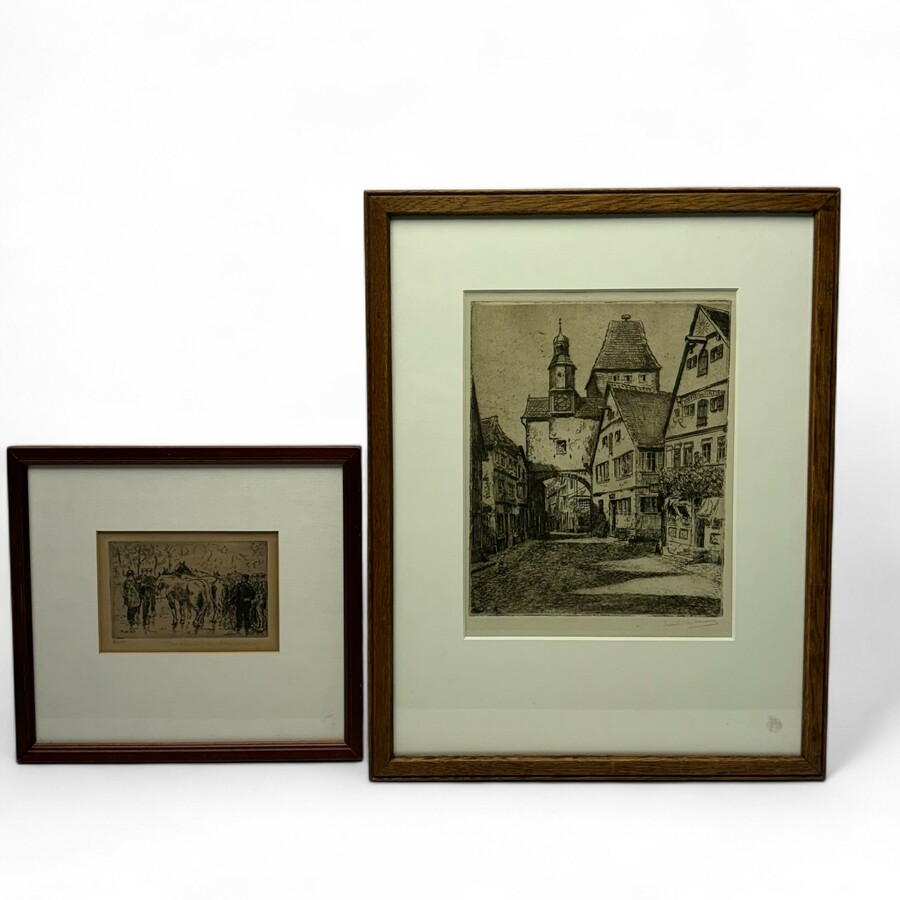 Martin van Waning (1889-1972). Twee etsen op papier. Paardenmarkt en stadsgezicht met poort en toren. Gesigneer in de plaat en met potlood.