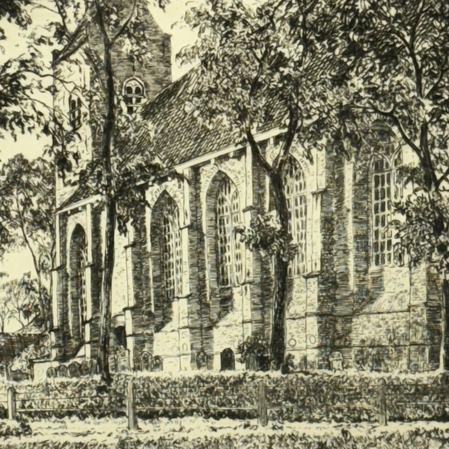 Ets op papier, voorstelling van de kerk van Blija. Rechtsonder geisgneerd Ids Wiersma (Brantgum 1878 - Dokkum 1965).