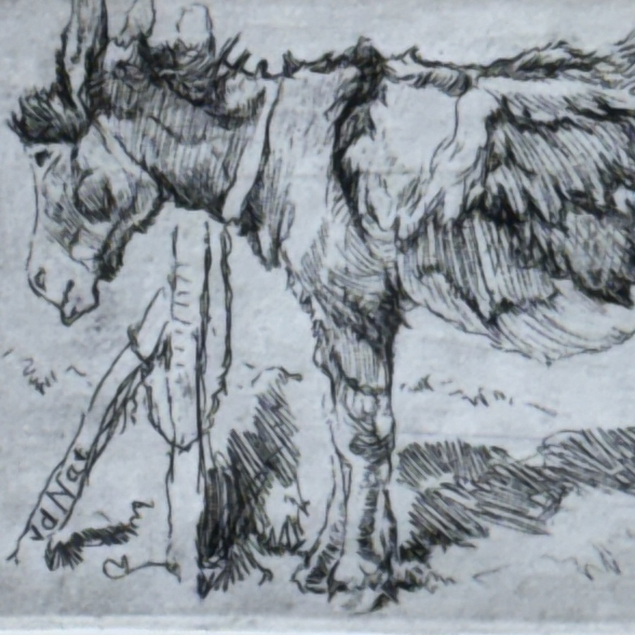ets op papier, voorstelling van een ezel. Gesigneerd in de druk Willem van der Nat (Leiden 1864 - 1929), gedrukt door Rien van der Nat.