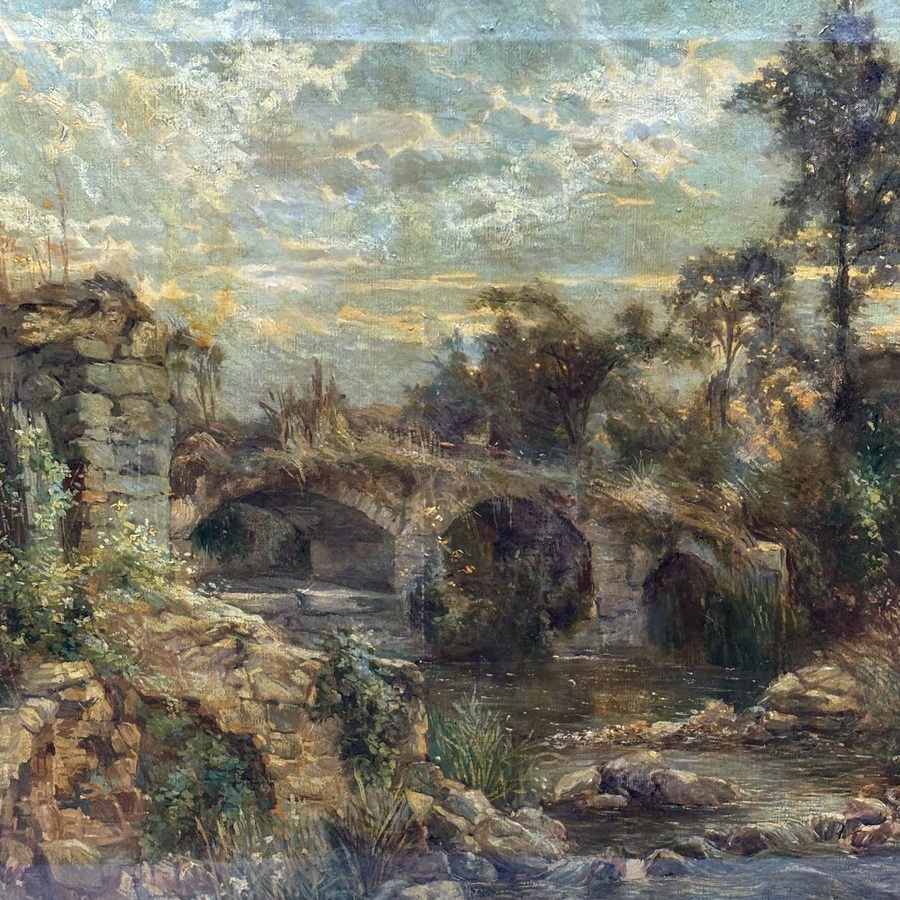 Schilderij, olieverf op doek. Landschap met stenen bruggetje. Rechtsonder onduidelijk gesigneerd.