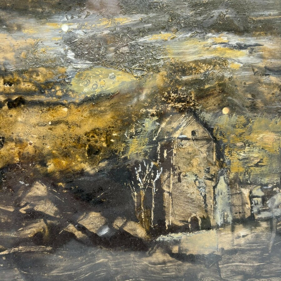 Gemengde techniek. landschap. Rechtsonder gesigneerd Meinte Walta (Wytgaard 1929 - Leeuwarden 2002). Rechtsonder gesigneerd. Gedateerd 1985.