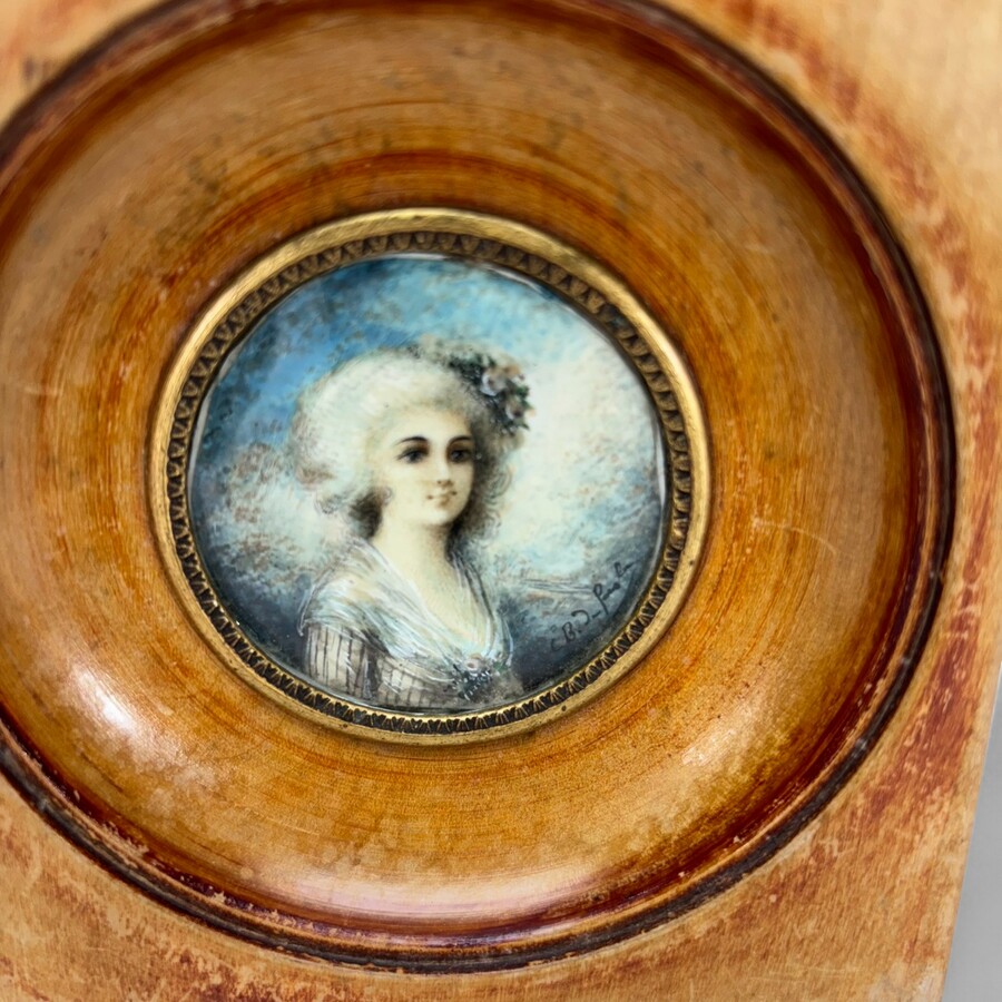 Een 18e eeuws miniatuurportretje op perkament, 5 cm doorsnede. Dame in gestreepte jurk. Gesigneerd C.B. du onduidelijk. In houten met messing lijst