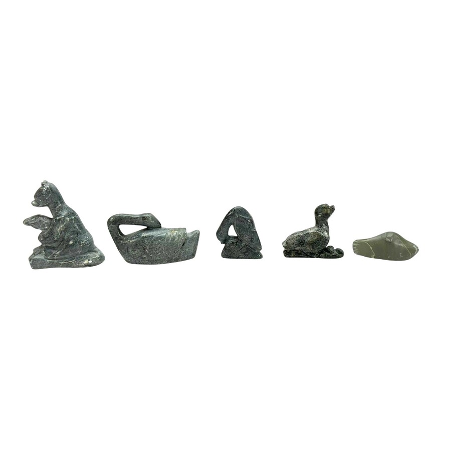 Lot van vijf uit spekstenen gestoken Inuit sculpturen, grootste is 10 cm hoog. Otter, zeehond, eenden en gans. Allen gesigneerd George (Arluk) Arlook. (geb 1949)