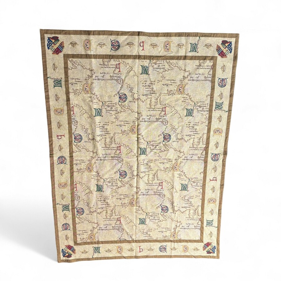 Een groot geweven wandkleed/ gobelin, . Met een voorstelling van een fantasie landkaart. 20e eeuws.