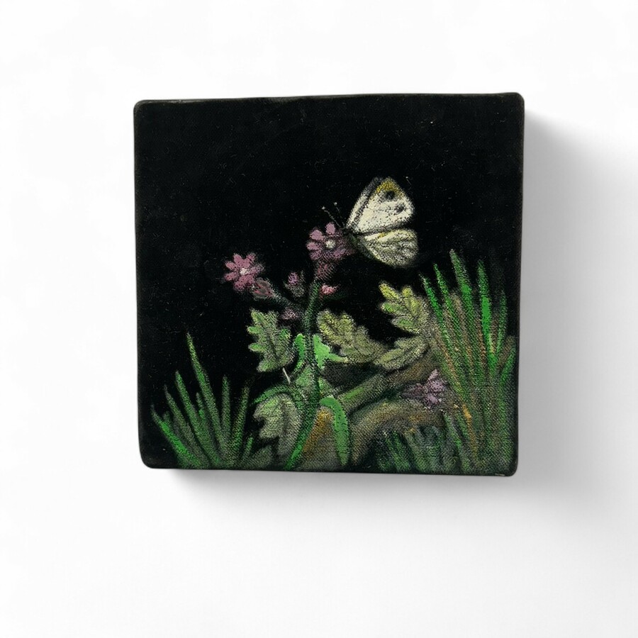 Schilderij plakaatverf op fluweel, . Veldbloemen met een vlinder. Niet gesigneerd, maar uit overlevering werk van G. J. Adema. (1898-1981).