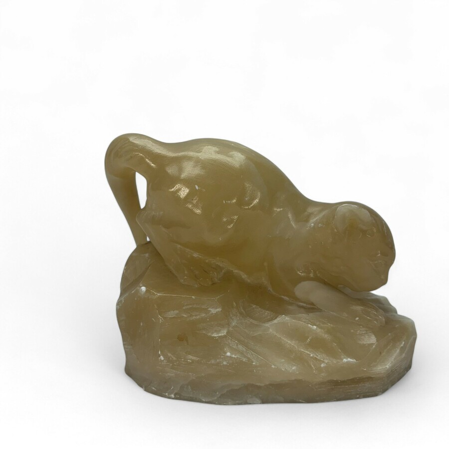 Een Italiaans uit wit albast gestoken sculptuur van een spelende kat, 12 cm hoog x 15 cm lang. Vroeg 20e eeuws. Niet gesigneerd.