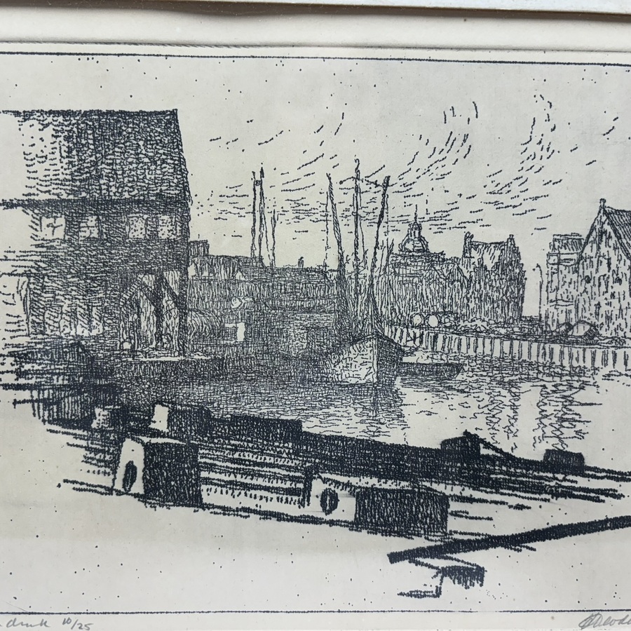 Ets op papier, Eigendruk 10/25. Havengezicht . Gesigneerd in potlood Jan Arjen Deodatus (1914-1986). Gelijst.
