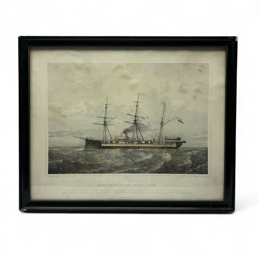 Een steendruk op papier. Afbeelding, deels ingekleurd van het oorlogsschip "Prins Hendrik der Nederlanden" Gesigneerd in de druk. J.C. Greive Jr. (1837-1891).