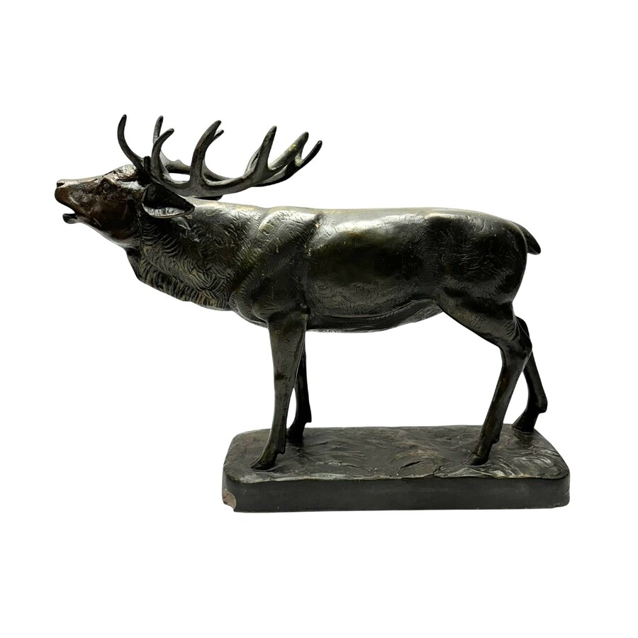 Een gebruineerd gipsen sculptuur van een edelhert. Met een messing plaatje met inscriptie 2 juni 1932.