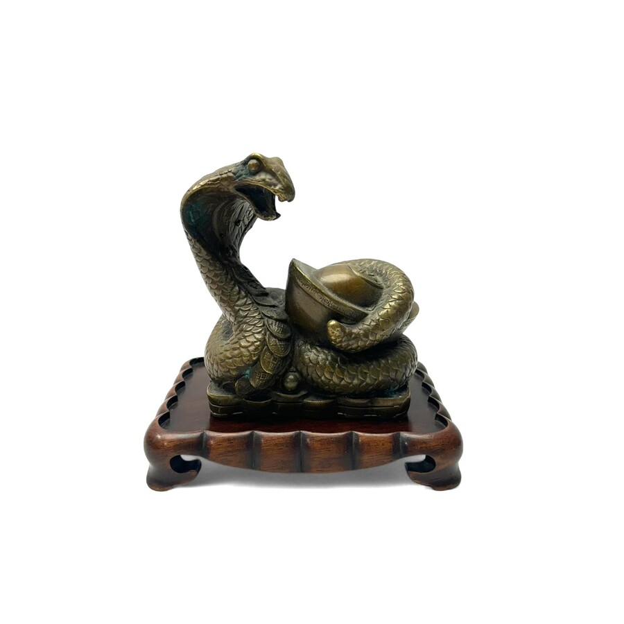 Een gepatineerd bronzen sculptuur van een Phyton gedecoreerd met geluksmunten Op een hardhouten sokkel. gemerkt aan de onderzijde. 20e eeuws.