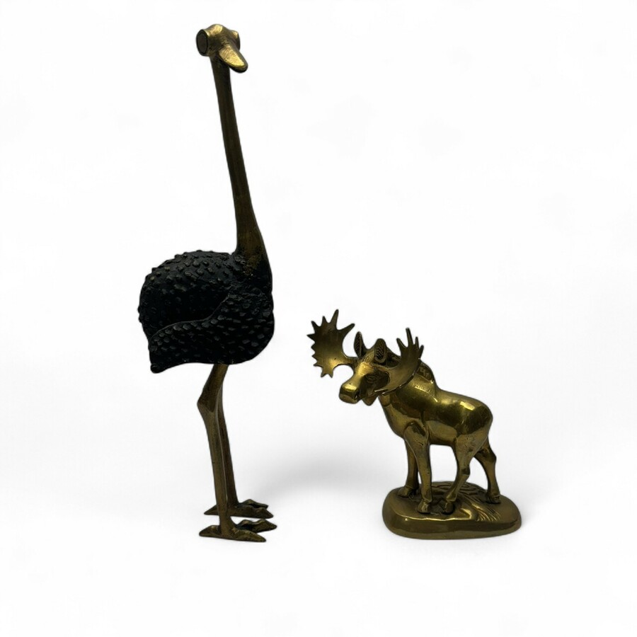 Twee bronzen scupturen van een struisvogel en een eland. Struisvogel, deels gepatineerd.