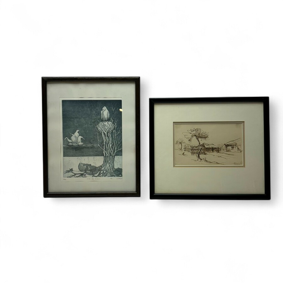 Een ets 75/150 voorstelling van diverse pingouins, gesigneerd. Hierbij een sepia aquarel transvaal landschap met boom en hutten. Onduidelijk gesigneerd 1937. Beide gelijst.