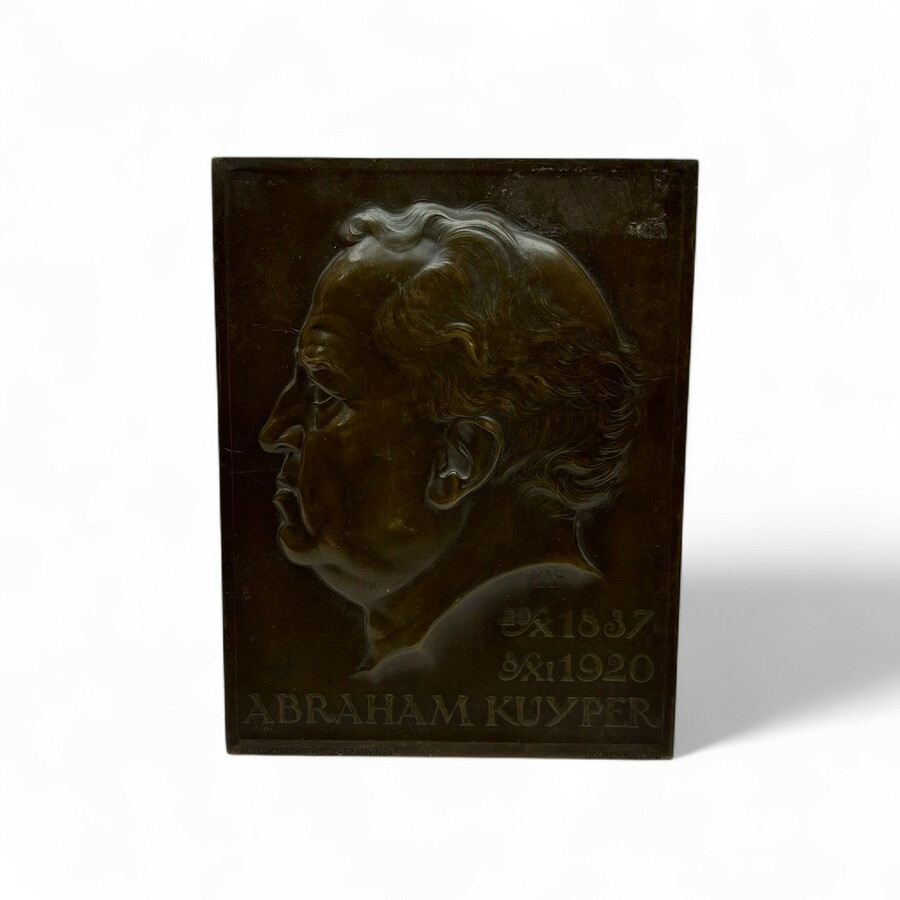 Bronzen plaquette met een portret van Abraham Kuyper (1837-1920). Ontwerp J.C. Weinecke (1872-1945) 1921 en uitvoering Hotzo Spanninga, Joure.
