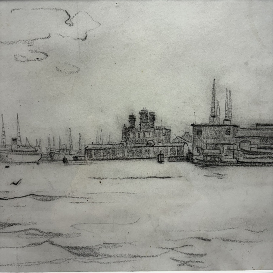Tekening op papier, 'De IJ haven Amsterdam 1955'. Rechtsonder gesigneerd Piet Hein van Asperen (Harlingen 1895 - Leeuwarden 1969). Herkomst: familie van de kunstenaar.