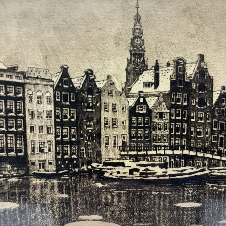 Ets op papier, Damrak Amsterdam. Rechtsonder gesigneerd Cornelis Brandenburg.