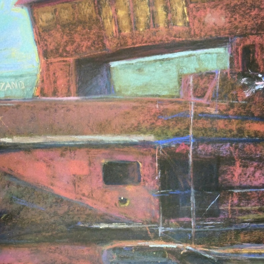 Gemengde techniek op papier, scheepswerf te Hoogezand. Linksonder gesigneerd Huib Rademakers (Ossenisse, 1951), gedateerd 1985