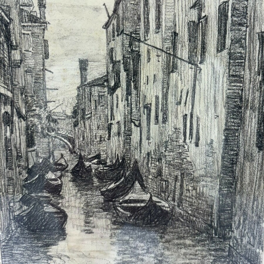 Houtskool tekening op papier, ,5 cm. Gracht te Venetië met diverse gondels. Gesigneerd Paul Arntzenius (1883-1965) 1912.