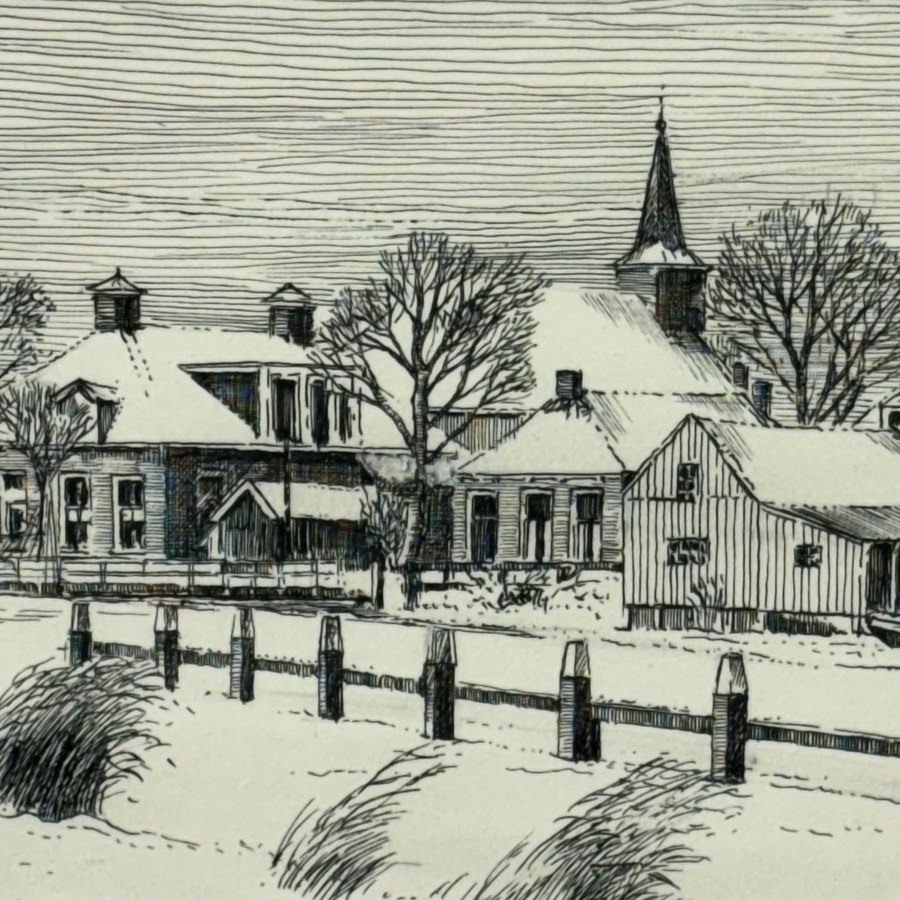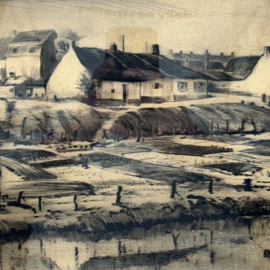 Ets op papier, voorstelling van een dorp met groentetuin aan het water. Rechtsonder gesigneerd Riekele Prins (Kollumerzwaag 1905 - Groningen 1954).