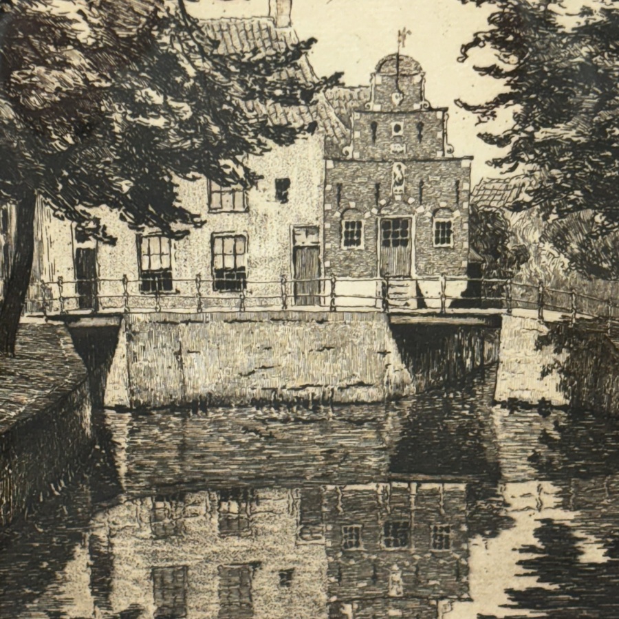 Ets op papier, 'Gracht met Korendragershuisje Franeker'. Rechtsonder gesigneerd Johan Hemkes (Schalsum 1894 - Bilthoven 1988).