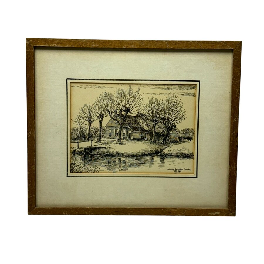 Inkttekening op papier, boerderij. Titel 'Noorderdwarsvaart Drachten', rechtsonder gesigneerd Piet de Vries (Koudum 1932 - Drachten 2003).