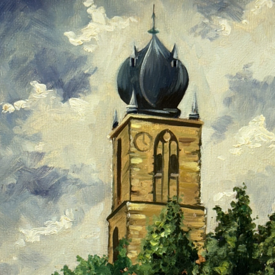 Schilderij, olieverf op board. De toren van Deinum. Rechtsonder gesigneerd Hans de Jong (Heemstede, 1938), gedateerd 1977. In vergulde lijst.